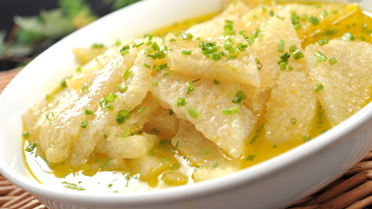 每百克猪皮中含蛋白质26.4%,为猪肉的2.5倍,而脂肪却只有2.27克,为猪肉的一半。特别是肉皮中的主要成分胶原性蛋白,能使人体皮肤富有弹性、白嫩、皱纹减少或消失,使人显得年轻。
