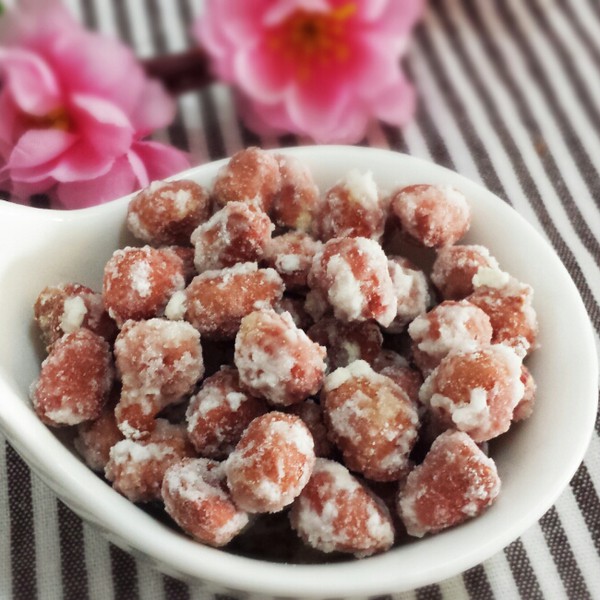 挂霜和拔丝不一样,挂霜必须要用水熬,这样做出来的菜洁白如雪。水、糖的大致比例是1:2,这样做不仅简单,也不用担心糖糊了。