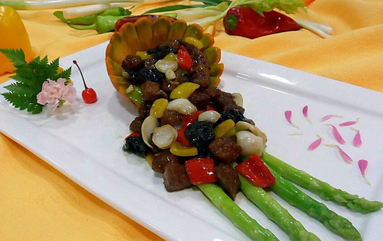 (2)分主次倒入法。分主次倒入法,适用于主料配料差别比较显著地勾芡的菜,装盘前先将主料较多或主料成形较好的一部分菜肴用手勺盛起,再将盘中余菜倒入盘中,最后将手勺中的菜肴铺盖在上面。例如炒腰花在装盘时,一般先将腰花较多、花形较好的一部分用手勺盛起,再将锅中的余菜倒入盘中,然后将手勺中的菜铺在上面,以突出主料,使其成菜美观。