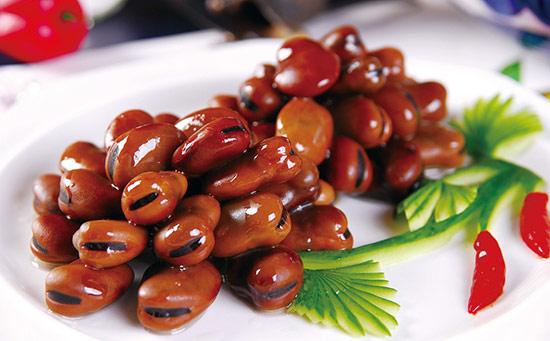 (4)扒入法适用于在锅中排列成整齐的平面或图案,装盘后仍不改变其排列形状的菜肴。装盘前,先从锅边的四周加油,并将锅晃几下,使得油润入菜肴下面,然后将锅倾斜,把菜肴溜到盘中。倒入时,锅不宜离盘太高,一面倒,一面将锅迅速向左移动,这样才能使排列好的形状不变,保持原来的样子。例如扒三白、扒菜心等菜肴都是用这种方法装盘。