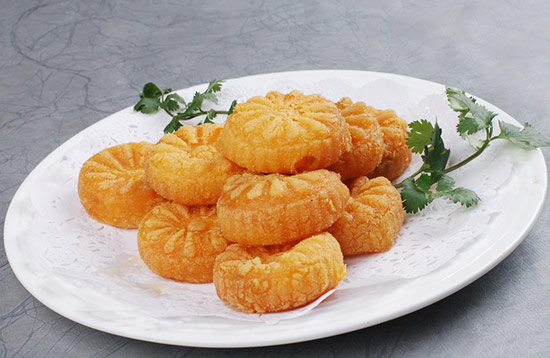 炸菜无芡无汁,块块分开。装盘时,先将菜肴倒(或捞)在漏勺中,沥干油,然后倒入盘中。到时可用筷子或手勺挡一挡,以防倒出盘外。如果装盘后菜肴的形态不够美观,可用筷子将菜肴略加拨动调整,使其均匀饱满,切不可直接用手操作,造成污染。