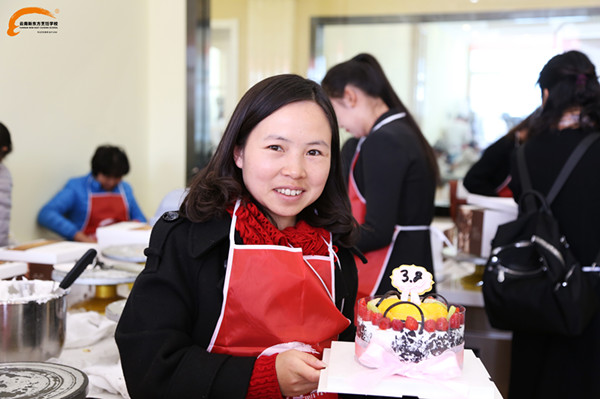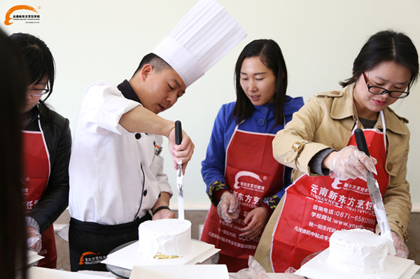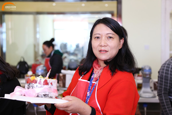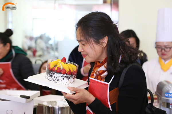 在一片愉悦的气氛中,女王们开始了自己“战场”之旅。蛋糕胚烤好,奶油打好,水果切好。在西点老师的专业指导下,女王们一步一步认真的制作着。有些女王说道:“平时看到蛋糕店西点师做蛋糕,抹奶油貌似很轻松的样子,没想到今天自己上手还是很费劲的,没一会手背就酸酸的了。虽然,做着有些蹩手蹩脚,好在新东方的西点学生也在一旁细心的指导着。”