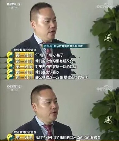新华教育集团常务副总裁许绍兵接受央视记者采访时提到:“新华教育集团旗下有新东方烹饪教育、欧米奇西点西餐教育、新华互联网科技、万通汽车教育、宇星驾训、美味学院等多个品牌,常年在校生20万人,在全国35个区域,拥有138所院校,其中农村孩子占80%,贫困生占10%。新华每年向社会输送人才近12万,并向毕业生提供可选择的就业岗位20多万个。