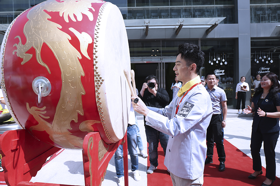 因为专注,所以专业;因为专业,所以荣耀。在“知行合一,明德尚能”的校训墙前,百名新东方烹饪学子穿着整洁校服,齐立三尺桌台前一展击鼓翻锅的磅礴气势。“一为三,二为五”,“八两油勺,三尺灶台”,击鼓翻锅欲聋震撼,恢宏之气直叫田树同学在折服于各“学长学姐”的专业技能之余跃跃欲试,现场更是拿起鼓槌和着学生的口号体验了一番震撼的击鼓翻锅。
