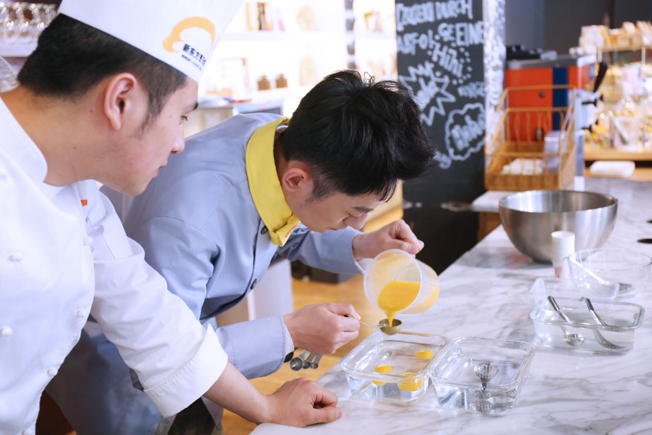 从传统面点“荷花酥、桃花酥”到“创新分子料理、一只生鸡蛋、液氮冰淇淋、果味鱼子酱配西班牙火腿”,再到中西融合“意面馄饨”,在体验了新东方丰富的课程之后,田树对传统中式面点、分子料理、新派融合西餐有了进一步的认识。