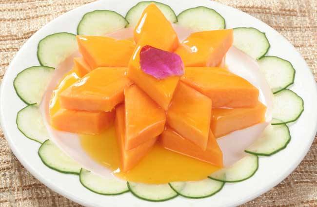 木瓜果皮光滑美观,果肉厚实细致、香气浓郁、汁水丰多、甜美可口、营养丰富。木瓜富含17种以上氨基酸及钙、铁等,还含有木瓜蛋白酶、番木瓜碱等,多吃可延年益寿。木瓜的吃法也是多种多样:加工成木瓜丁,是一道极具风味的可口小吃;或做木瓜牛奶,美容养颜;木瓜煲汤,养生滋补,让人垂涎三尺。
