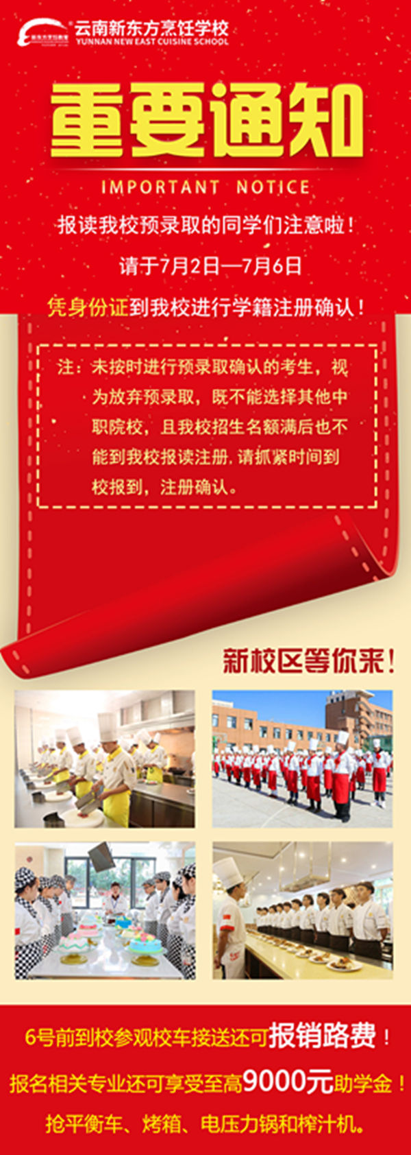 我们这里是云南新东方烹饪学校。经审核,您的孩子已被云南新东方烹饪学校(统一招生代码:530A07) 预录取。请于7月2日9:00—7月6日18:00,前往云南新东方烹饪学校(车家壁校区)报名点确认,凭二代身份证进行学籍注册确认,并按云南新东方烹饪学校预录取的相关要求按时报到入学。