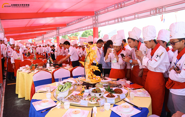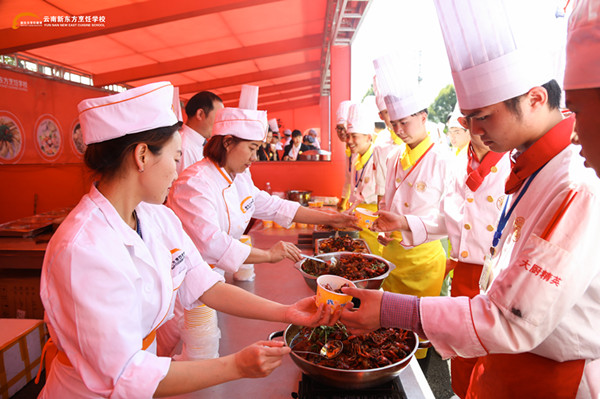 云南新东方办学至今,一直以实操为主理论为辅的教学模式在教授学生。今天,云南新东方的学生是时候展示自己的真本领了。宴席大赛,不仅仅考的是学生们的动手能力,还在考验同学们的对于一桌宴席的菜品研发、营养搭配以及成本核算等等。