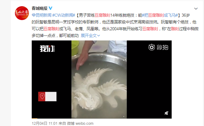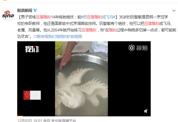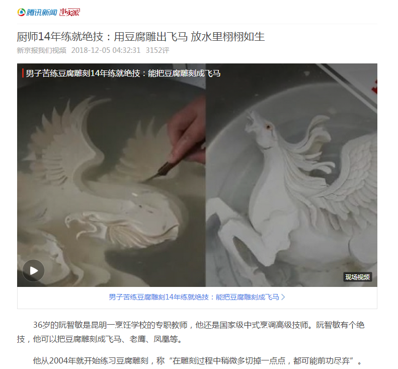 阮智敏老师从事食物雕刻工作,十几年如一日潜心钻研食物雕刻艺术,不断充实知识丰富艺术想象力,12月5日阮智敏老师的豆腐雕刻有幸被腾讯新闻、新京报、云南春城晚报、新浪新闻等媒体报道。