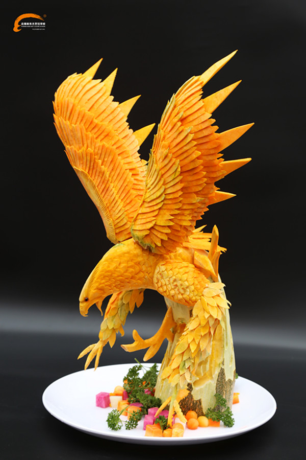 南瓜在我们的日常生活中再普通不过的一种食材,但在云南新东方烹饪学校学子的手中,它们却可以从平凡变得不平凡,将腐朽化为神奇。一个圆滚滚的南瓜变成踏浪的麒麟、冲天的飞龙,将普通的萝卜变成张翅的雄鹰、开屏的孔雀……