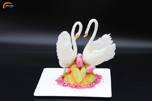 雕刻作品的使用是多方面的,它不仅是美化宴席,烘托气氛的造型艺术,而且在与菜肴的配合上更能表现出其独到之处。它能使一个精美的菜肴锦上添花,成为一个艺术佳品,又能和一些菜肴在寓意上达到和谐统一,令人赏心悦目,耐人寻味。