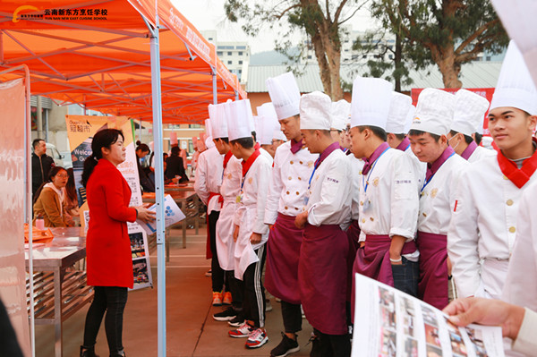 云南新东方烹饪学校吴校长:“我们会举行校企合作这样的形式,也就是学生在没有毕业之前,我们就和很多企业进行交流,企业来到学校以后,它开设定向班。学生在学校的课程,企业涉及到它的一些企业文化、相关的菜品,植入到在学校的学习阶段,然后学生毕业直接去它的企业,称之为校企定向合作班级。”