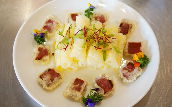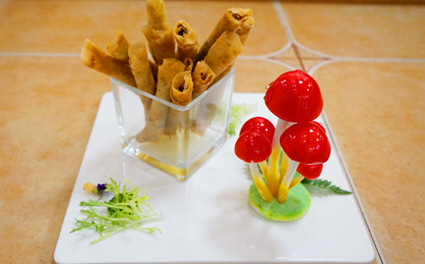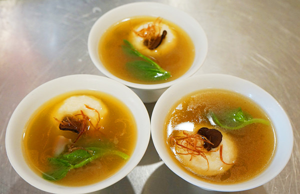 莫大师到校以后,便马不停蹄的开始了教学课程的演示,此次莫大师带来的四道菜都是滇菜的经典菜式:脆皮干巴菌、宫保虾球、云南三宝、山珍菌豆花。