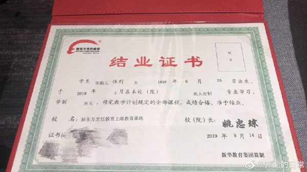 明星学厨记 恭喜宋祖儿喜提新东方烹饪结业证书