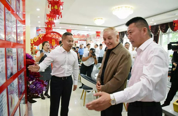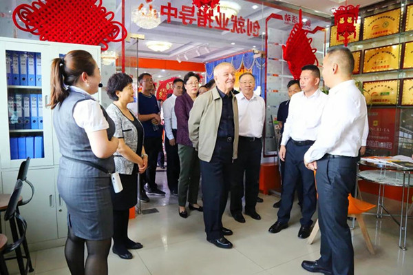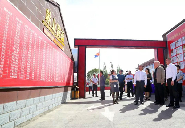 艾力更·依明巴海副委员长(右二)了解学子创就业案例,新华教育集团常务副总裁许绍兵(左一)作介绍