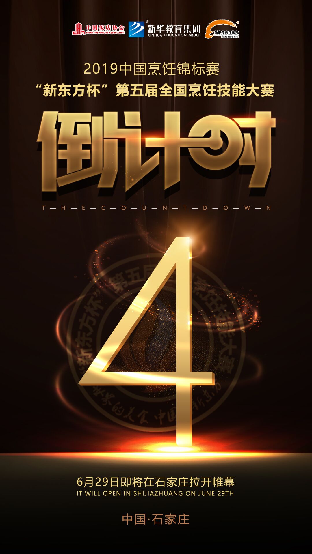 由中国饭店协会、新华教育集团主办,石家庄新东方烹饪学校承办的2019中国烹饪锦标赛丨“新东方杯”第五届全国烹饪技能大赛,将于2019年6月29日—30日在燕赵大地隆重举行,距离大赛开幕现已进入倒计时4天!