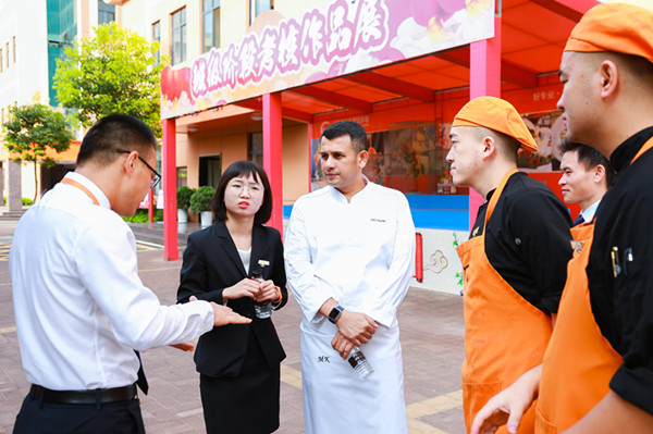 继5月29日,我校组织优秀班主任教师进入昆明索菲特大酒店与默罕默德行政总厨交流分享后,(昆明索菲特大酒店参观交流文章分享:http://www.ynxdfpr.com/a/safeguard/jyxx/jyxx2019/3465.html。)7月17日,雅高酒店集团大中华区行政总厨兼昆明索菲特大酒店行政总厨默罕默一行人莅临我校参观交流。