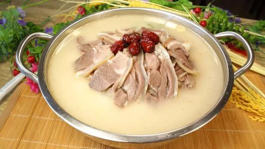 4.掺白汤,放羊肉、味精、鸡精、胡椒粉、料酒、当归,烧沸。