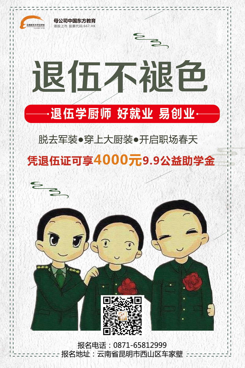 在云南新东方烹饪学校,每当临近军人退伍季,很多军人及其家属便来校咨询军人退伍学厨事项。他们利用一两年的时间在专业厨师学校里接受技能培训,相信定可以掌握好扎实技能,改变人生,实现梦想!