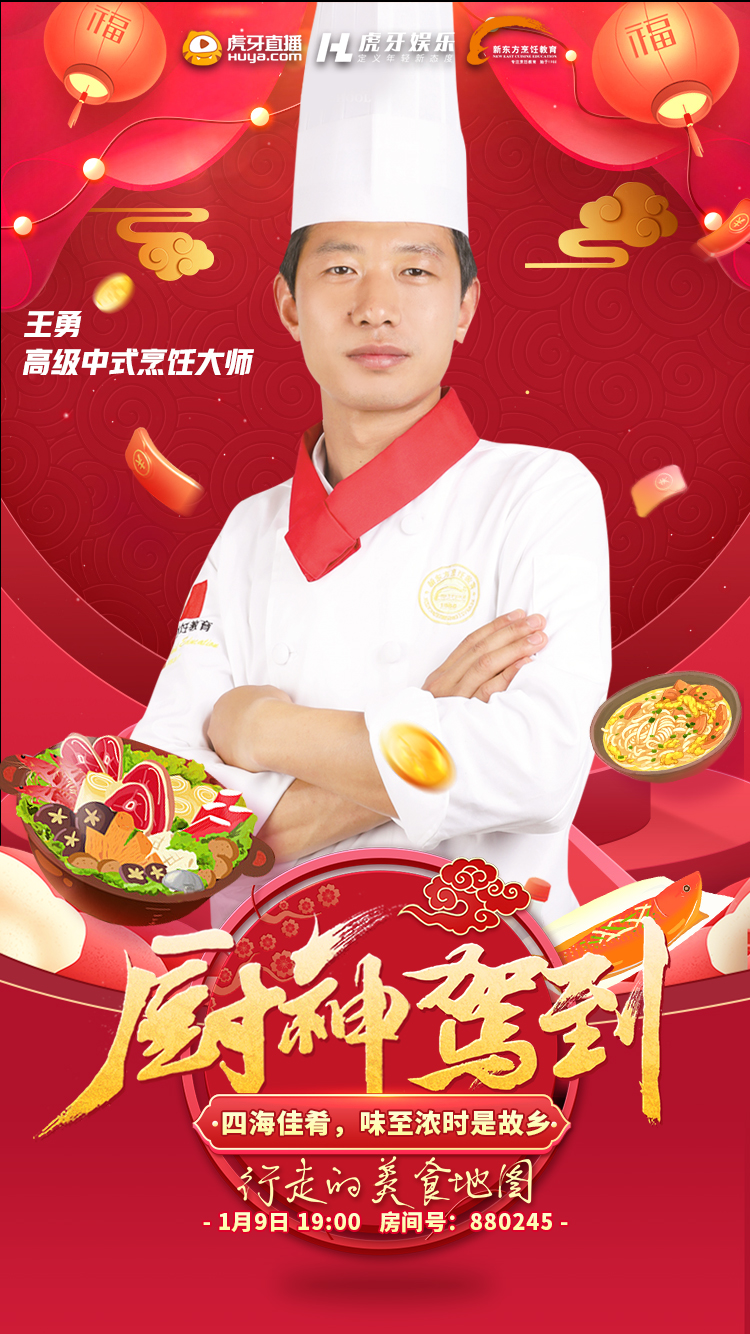 节目期间,新东方高级中式烹饪大师王勇也将继续在直播间做出精彩的美食点评,科普你不知道的地方年俗。直播间还为大家准备了限量版精美周边礼品,小伙伴们只要观看直播就有机会领取专属福利。更多精彩,1月9日19:00锁定虎牙直播间厨神驾到,让我们携手庆新故岁,欢度良宵吧!