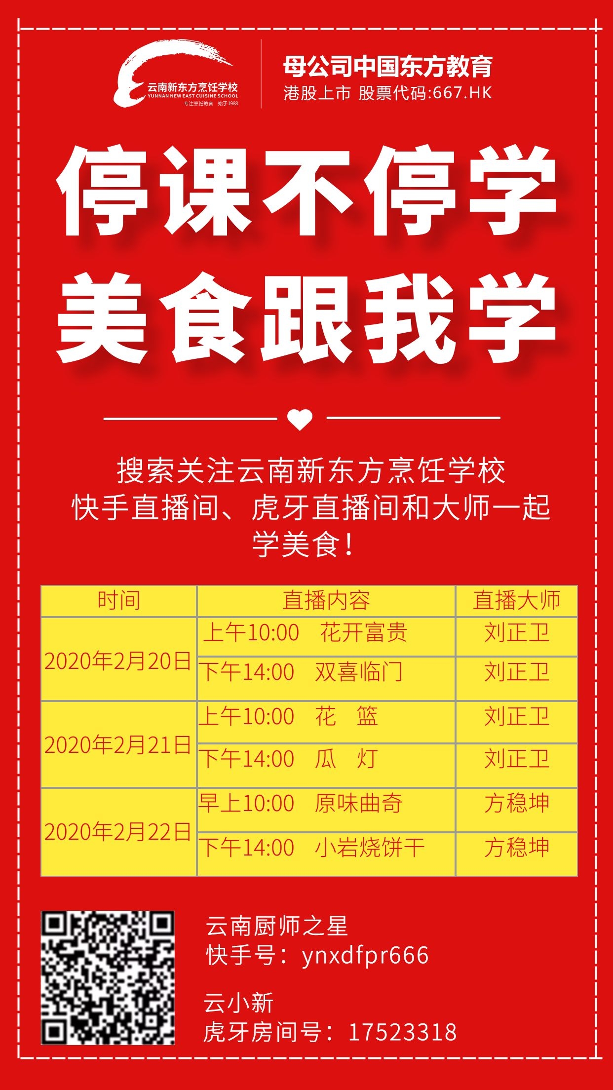 亲爱的同学们,现在假期时间延长,每天宅在家中不能出门,想学习的心是不是早已按捺不住了?别怕!云南新东方烹饪学校线上美食直播课堂火热进行中,资深大师在线教学,宅在家里也能学,每天变着花样吃,任何美食都能手到擒来!