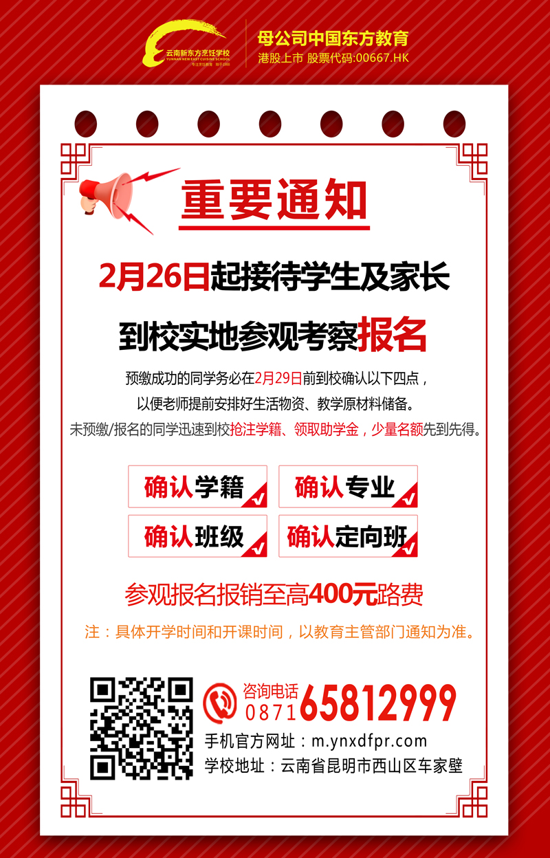 2、未预缴/报名的同学要迅速到校抢注学籍、领取企业助学金,目前,云南新东方学籍注册名额、名企名师班名额、企业助学金名额处于名额告急阶段。