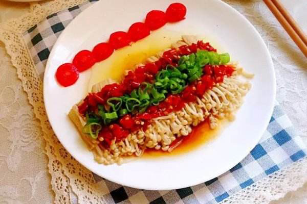 4、在金针菇上面均匀的淋上2勺蒸鱼豉油,另起锅,烧热2勺花生油,撒上葱花后,把热油浇灌在金针菇上面