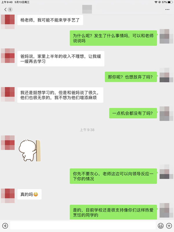 近期,正值开学季,但是很多想要来云南新东方烹饪学校学习的同学告诉我校课程顾问老师,因为此次疫情家里面的经济带来了一定的影响,可能连自己的学业也会耽搁,我校课程顾问老师在与同学交谈的时候,能够从他的字里行间感受到他想要学习烹饪的心情。