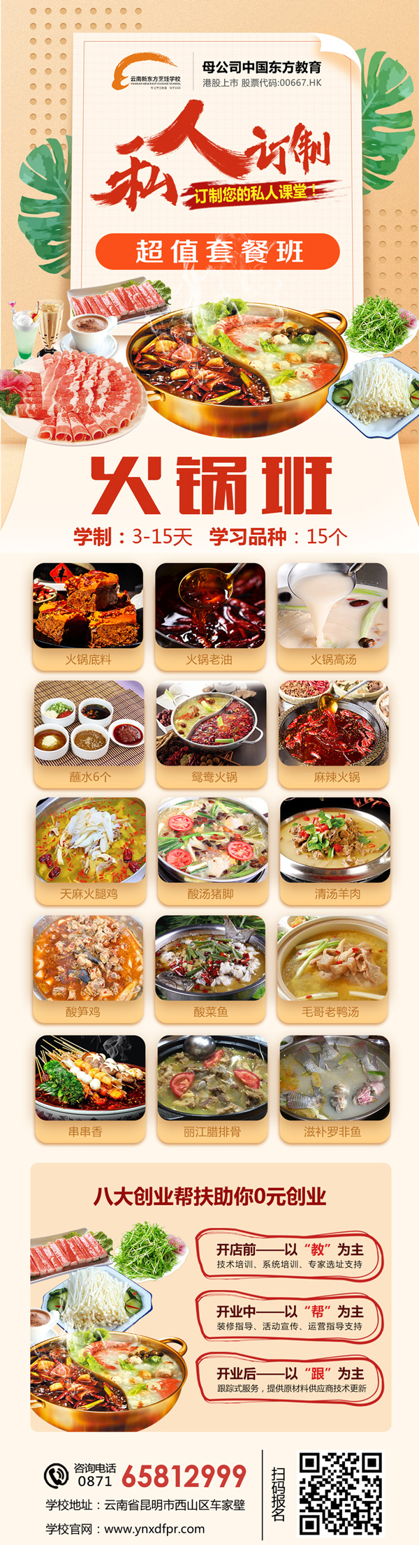 那么,怎么才能够学到地道的特色火锅技术呢?如果你打算创业开火锅店,那么建议你到专业的学校学习。在云南新东方烹饪学校开设有特色火锅创业班,大师手把手教你炒制火锅底料、制作汤底、配置蘸料,学到满载而归。从而让你毕业既能开店创业。