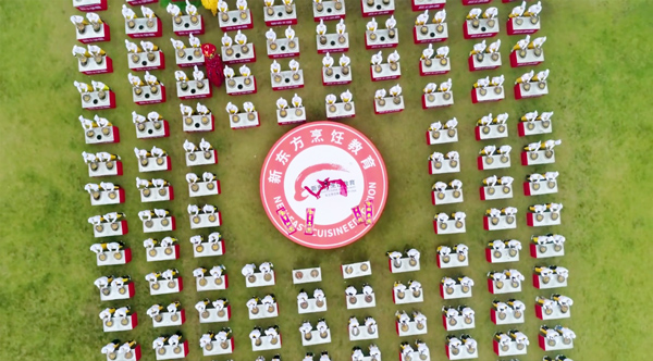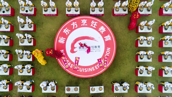 草坪上一列列学生组成方队,他们身着新东方烹饪厨师服,头戴厨师帽,整装待发。 鼓声响,锅勺动。伴随着一阵又一阵的“咚咚锵,咚咚锵……”新东方烹饪学校的学子们踩着节奏,将手中的铁锅和颠勺化为一把把乐器,演奏了一场别具一格的“五谷丰登音乐会”。