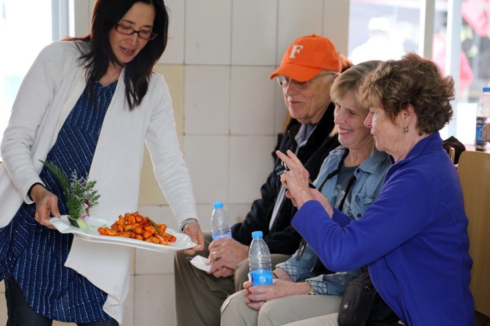 经过一早上的辛劳,美国友人们终于品尝到自己制作的美食,露出了欣喜的笑容。