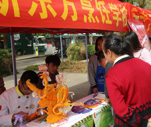 云南新东方展台的每一个作品都吸引了大量市民参观拍照,老师们与市民朋友深入交流烹饪技巧以及健康养生方面的知识。中华饮食文化博大精深,云南新东方烹饪学校是云南省规模最大、最专业的厨师学校,是培养国家高级烹调师、技师和烹饪管理人才的国际餐饮教育基地,拥有实力雄厚的全国性教育网络和资源,办学28年来,学校以传承和发扬中华美食文化为己任,为社会培养了数以万计的厨师精英,融汇川菜、滇菜、粤菜、徽菜、鲁菜、苏菜、闽菜、浙菜等全国各大菜系之精髓,开设了金牌大厨、大厨精英、经典西点、西点精英、烹饪精英等20多个专业,纵跨中餐、西餐、面点、调酒、面塑、雕刻、糖艺、小吃等领域。加之连续两年的昆明地区职工“七十二行技术大练兵”餐饮类竞赛都在云南新东方圆满举办,云南新东方将更加务实的提升教育教学品质,为每位学子提供最为优质的教育服务。