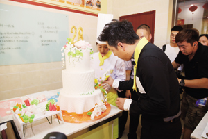 一走进西点课堂,西点甜品浓郁的奶油芳香扑面袭来,琳琅满目各具特色的西式甜品让人仿佛置身在了甜品屋。正在制作翻糖蛋糕的新东方烹饪教育留法大师王寅如吸引了黄渤的目光。只见王老师先用糖扑将糖粉面均匀的扑在案板上,用牙签将粉色素粘在糖膏上,将其揉搓均匀后擀成一大圆片,然后借用五瓣花模具,一朵娇艳欲滴盛开的玫瑰花呈现在眼前。神奇的美食体验邂逅男神的好奇心,看到翻糖蛋糕的制作过程,生活中较少接触到西点制作的黄渤直呼:“今天来的太值了!”随后,黄渤在这款唯美精致的蛋糕上签下名字,作为纪念。