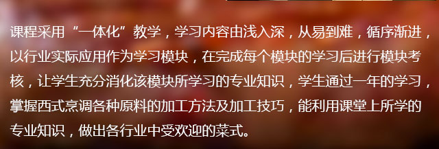 通过系统学习,学生能熟练掌握流行的欧美名菜、东南亚风味代表菜的制作技术,培养学生 具有创新能力,具有烹饪工艺美感,良好的职业道德,毕业后能胜任酒店宾馆技术骨干,能 快速设计、完成常规宴会的组织制作,具有管理西餐运营的能力。